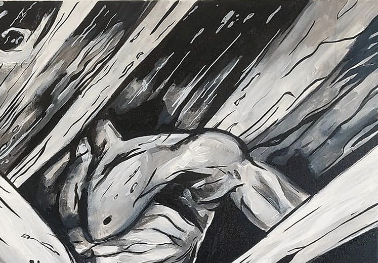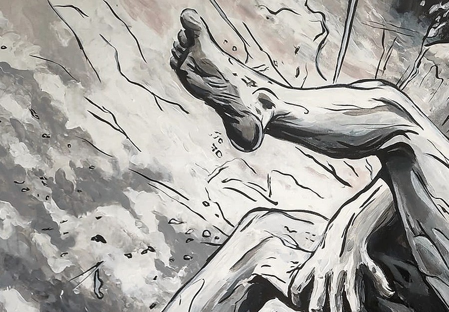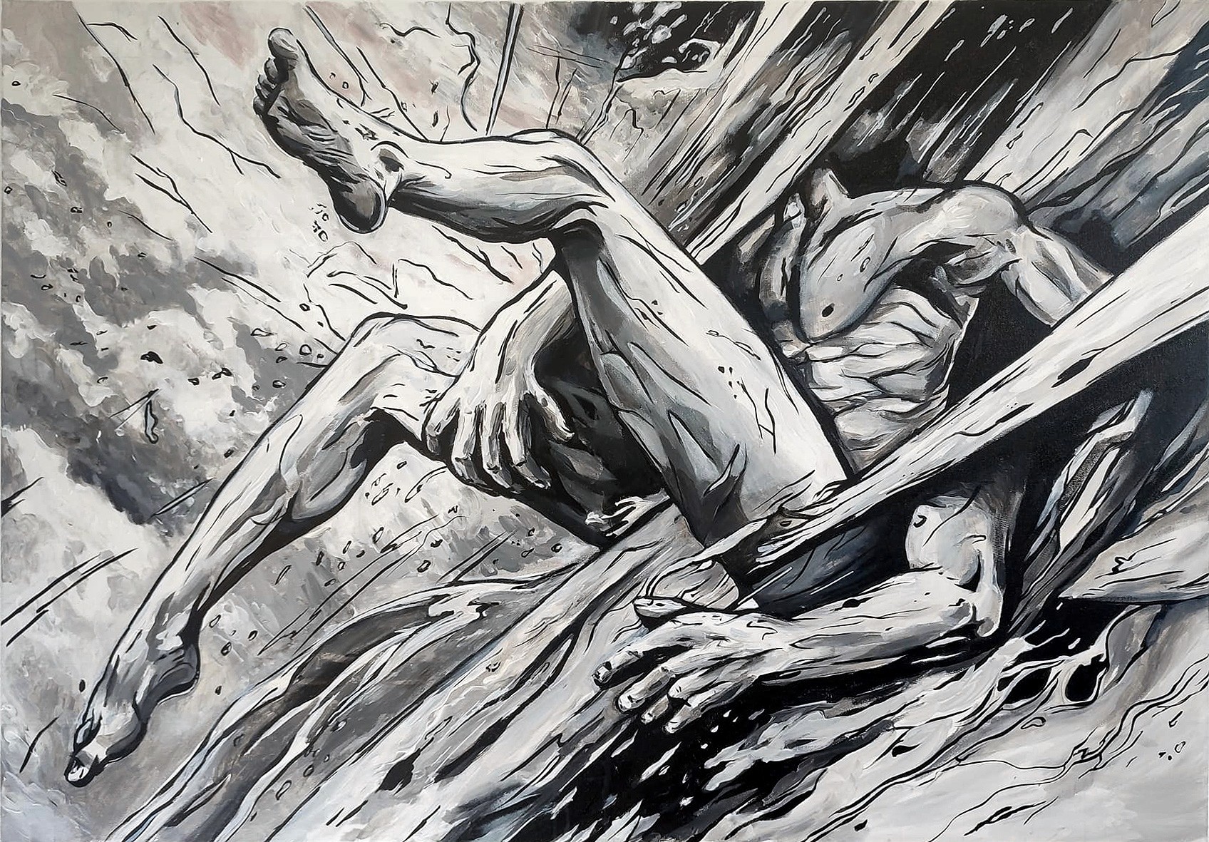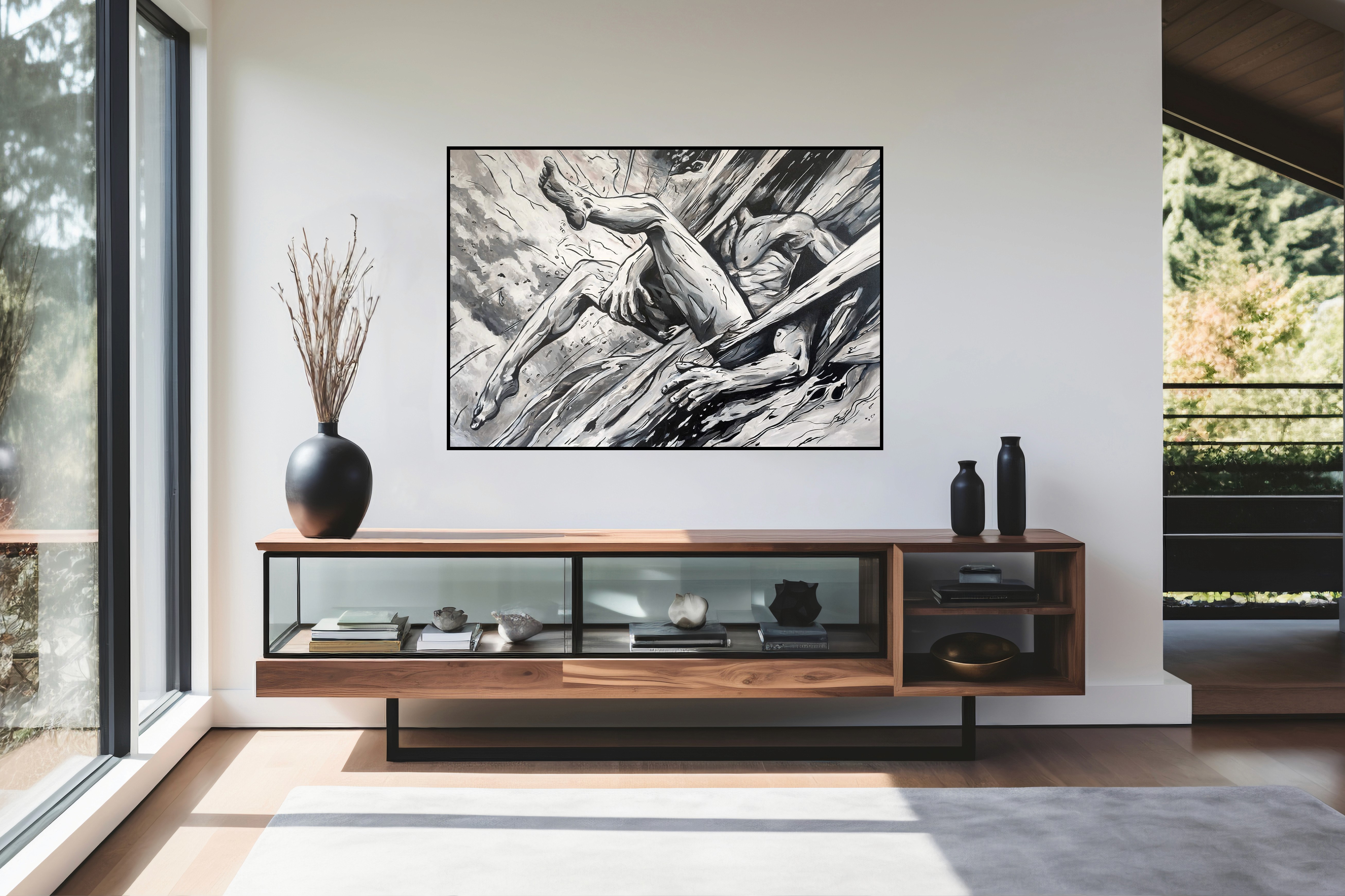Monochrome composition capturing a human figure suspended in a moment of rupture and transformation. Dynamic fractures of light and shadow evoke the emotional weight of surrender, resilience, and rebirth. This striking piece speaks to the universal experience of being broken open by life—only to emerge changed, stronger, and profoundly human.