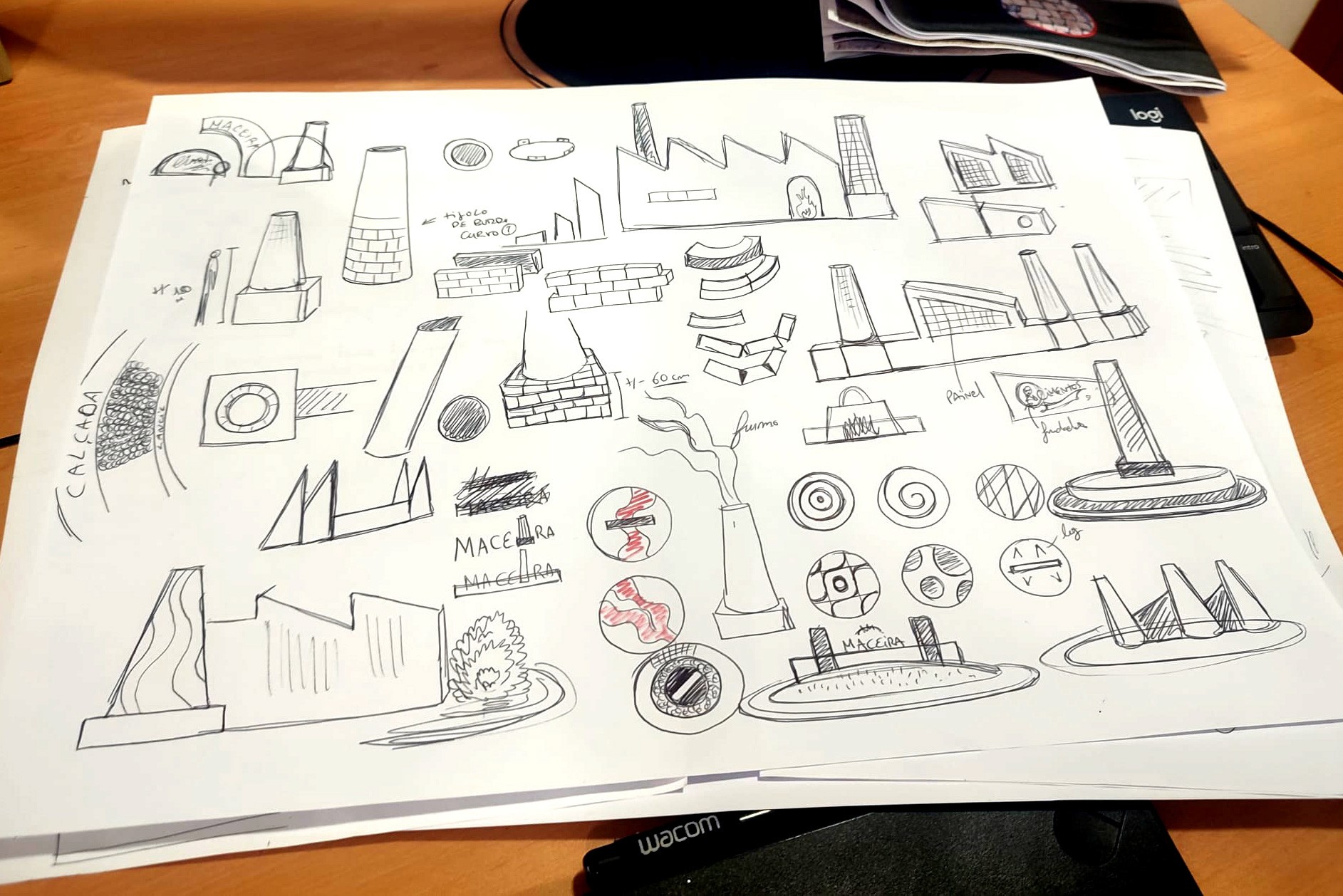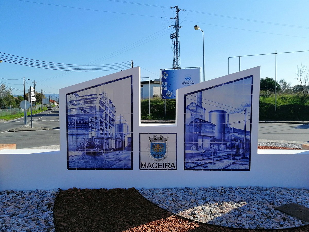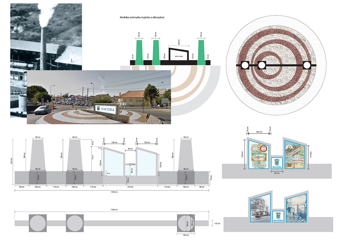 This project required extensive research into a factory that once served as the center of the village but no longer exists. I developed two design proposals after extensive sketch exploration. The final design directly references the factory’s original architecture: a small-scale replica of the three chimneys was built using clay bricks (“tijolo de burro”), matching the original materials and structure. A long white wall with two diagonal elements evokes the factory’s sloped roofs. Four ceramic tile panels were created: two featuring period advertising designs, and two illustrating the factory and its workers. The ground was finished with white stone and crushed bricks, while eco-friendly solar lights animate the installation at night. Today, this work serves as a reference point, honoring the past and preserving the memory of the village’s industrial heritage.
